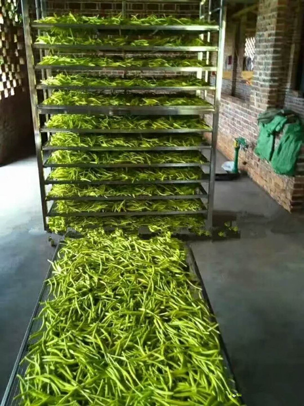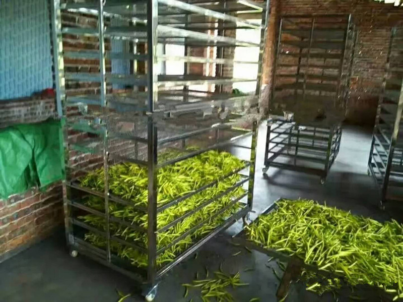 烘干工藝第三步:將高溫蒸煮后的黃花菜均勻鋪放到物料車內(nèi),注意厚度均勻,每層不超過3CM。